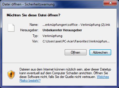 Folge von letzterem war, dass meine Verknüpfungen aus der Toolbar Links wieder mit einer Sicherheitswarnung quittiert werden: