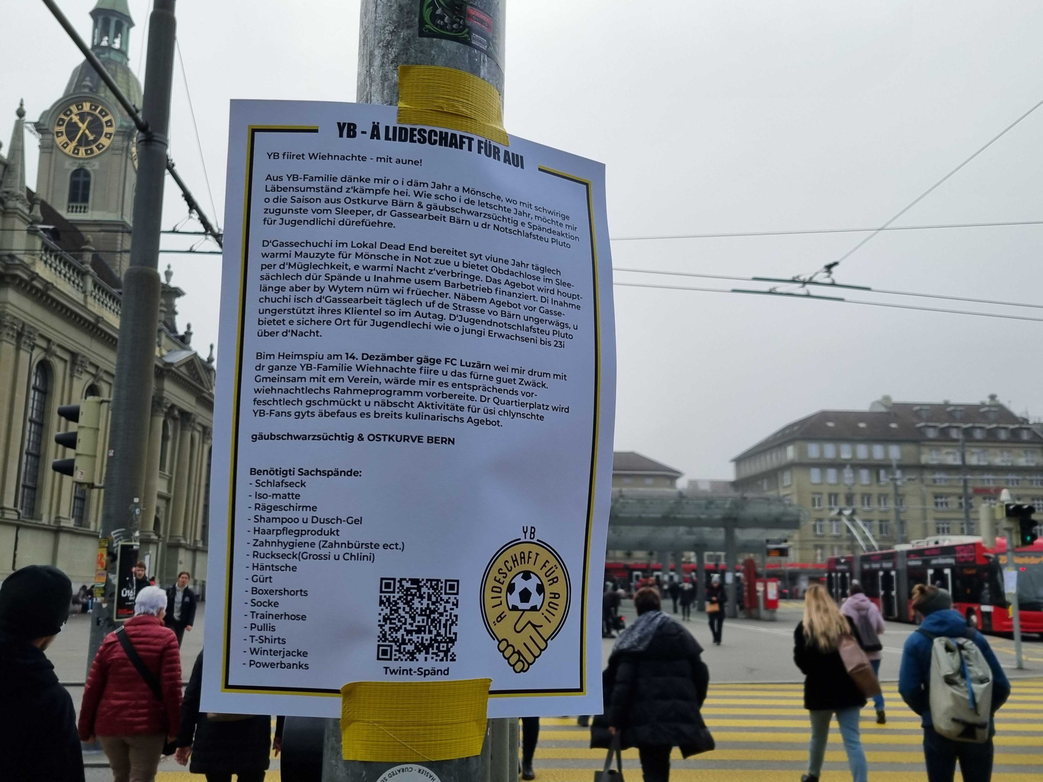 Mit einer Sammelaktion vor dem Spiel gegen den FC Luzern möchten die Berner Fanclubs Geld für Bedürftige sammeln. Sie werben auch über Zettel in der Stadt.